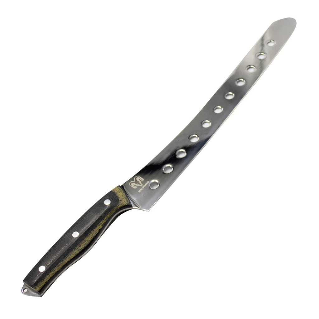 A Faca Brisket Ram eleva o padrão de excelência para mestres do churrasco e entusiastas da gastronomia. Com design moderno, lâmina longa e ponta redesenhada, oferece cortes precisos e amplos. O cabo em Micarta Crimson Black combina resistência e sofisticação, garantindo durabilidade e estilo. Detalhes como furos na lâmina facilitam o escoamento de líquidos, evitando aderência e tornando cada corte mais suave. Um item premium e funcional, perfeito para quem busca performance, exclusividade e inovação à altura da marca Ram.